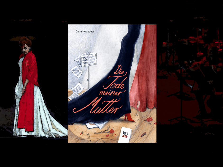 Autorin und Illustratorin Carla Haslbauer wuchs selbst als Tochter einer Opernsängerin auf und kann somit in dieser Geschichte auf Selbsterlebtem zurückgreifen. Dies spiegelt sich einerseits in der Absurdität wieder, wenn die Mutter in unterschiedlichen Aufmachungen und somit Persönlichkeiten mit ihren Kindern z.Bsp. Einkaufen geht. Andererseits spricht gerade aus dem normalen Umgang der Kinder zu dieser Absurdität eine große Herzlichkeit. „Die Tode meiner Mutter“ entstand als Abschlussarbeit zu ihrem Studium in „Illustration Fiction“ an der Design & Kunst-Hochschule in Luzern und ist somit ihr erstes Bilderbuch. Ihre Illustrationen wirken wie Bleistiftzeichnungen, die sich – ähnlich wie die Vokale bei den Stimm-Übungen der Mutter – leicht über das Papier verteilen und somit perfekt unperfekt voller skurriler Details erscheinen. Während der Alltag in frischen Farben daherkommt, wird die Bühnenwelt in dramatisch-dunklen Nuancen getaucht. Amüsiert habe ich mich auch über das Kuschelhäschen der Tochter, das – einem Running Gag gleich – unserer kleinen Ich-Erzählerin im Alltag zur Seite steht und deren Emotionen widerspiegelt.