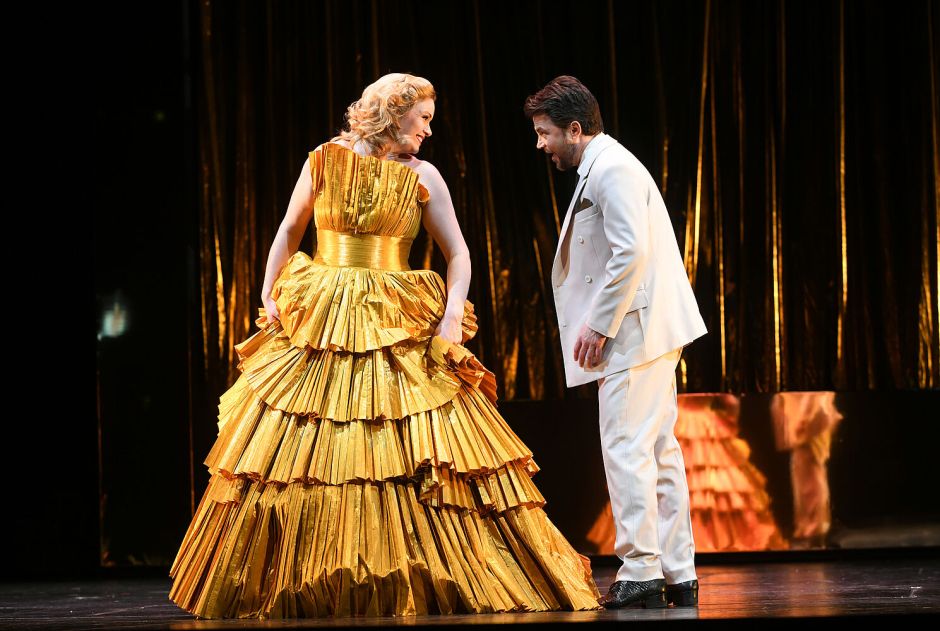 Apropos „Drama“: Selten habe ich das „Vilja-Lied“ so gefühlvoll und zugleich so traurig vernommen, wie in der Interpretation durch Signe Heiberg. Bei ihr ist Hanna Glawari eine moderne, selbstbewusste Frau, die von den enervierenden Avancen der Männer so angewidert ist, dass sie nur mit Mühe höflich bleiben kann. Fein nuanciert setzte sie ihren Sopran ein, um so auch musikalisch die Kränkungen zu verdeutlichen, die die Figur erleiden musste. Das Duett „Lippen schweigen, ’s flüstern Geigen“ gestaltete sie gemeinsam mit Konstantinos Klironomos äußerst innig und exquisit. Graf Danilo Danilowitsch ist bei Konstantinos Klironomos ein absoluter Heißsporn. Mit seinem potenten Tenor setzte Klironomos beim Gassenhauer „O Vaterland/ Da geh’ ich zu Maxim“ eine erste gesangliche Marke. Doch auch darstellerisch konnte er das ambivalente Verhalten dieses charmanten Hallodris glaubhaft vermitteln, der seine wahren Gefühle gegenüber Hanna nur schwerlich verstecken kann.